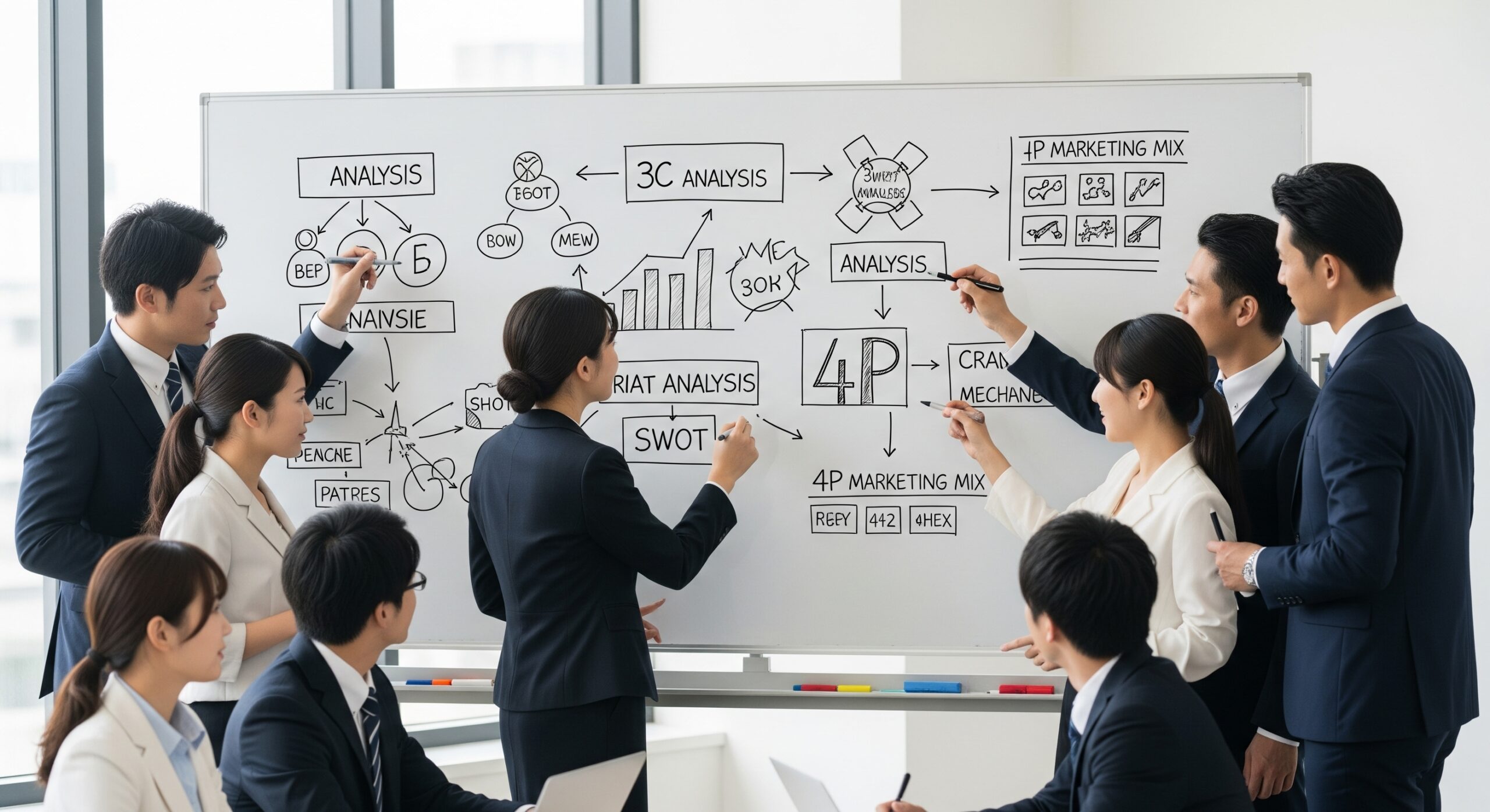 収集した情報は、単に集めるだけでなく、意味のあるインサイトを導き出すために分析する必要があります。ここでは、後述する3C分析、SWOT分析、ファイブフォース分析、4P分析などのフレームワークが非常に有効です。