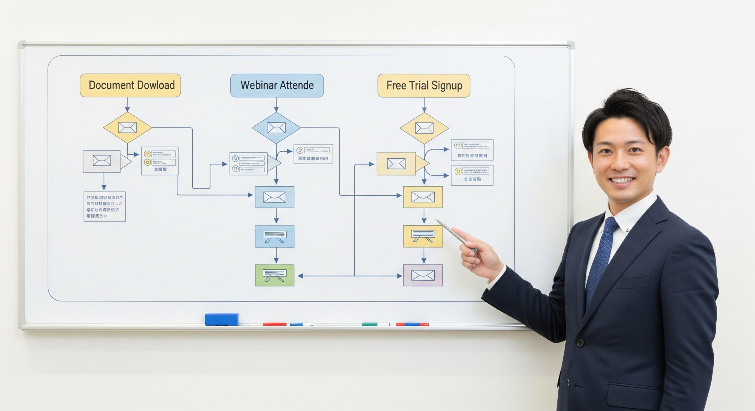 ペルソナが自社を認知し、最終的に契約に至るまでのプロセス(カスタマージャーニー)を可視化します。そして、各段階でペルソナがどのような情報を求めているかを考え、それに合わせて「いつ」「どのような内容の」メールを送るか、というシナリオを設計します。